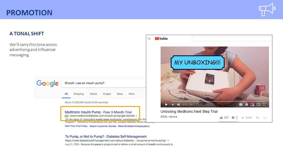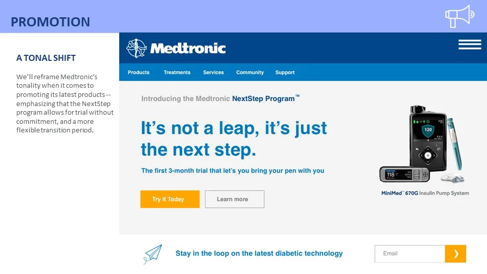 Once we understood that fear was the primary driver behind the behaviors that prevented most insulin pump adoption in recently diagnosed Type 1 Diabetes Patient's therapy, we conducted a market analysis to evaluate Medtronic’s (and their competitors) messaging to new Type 1 Diabetes patients.